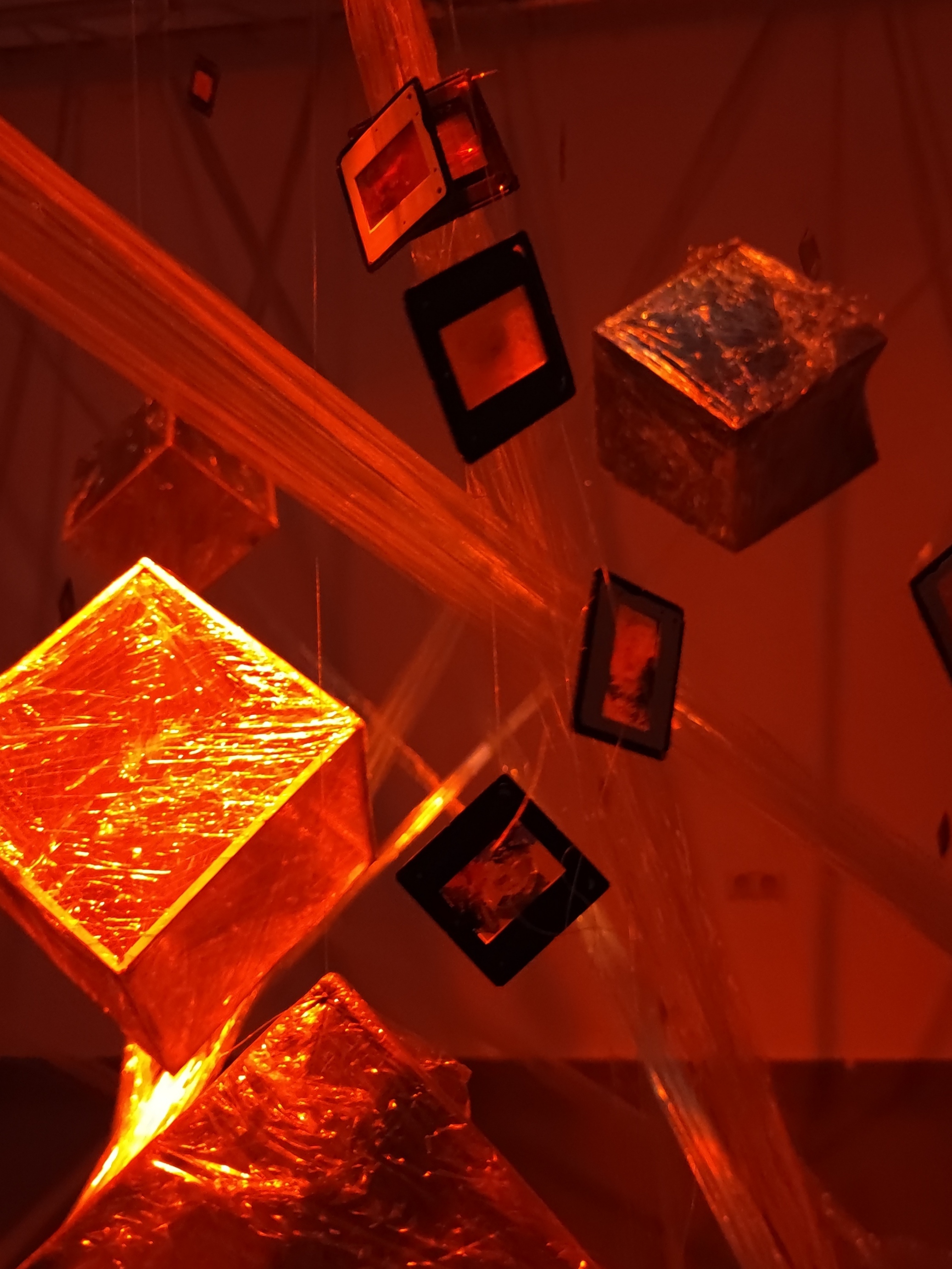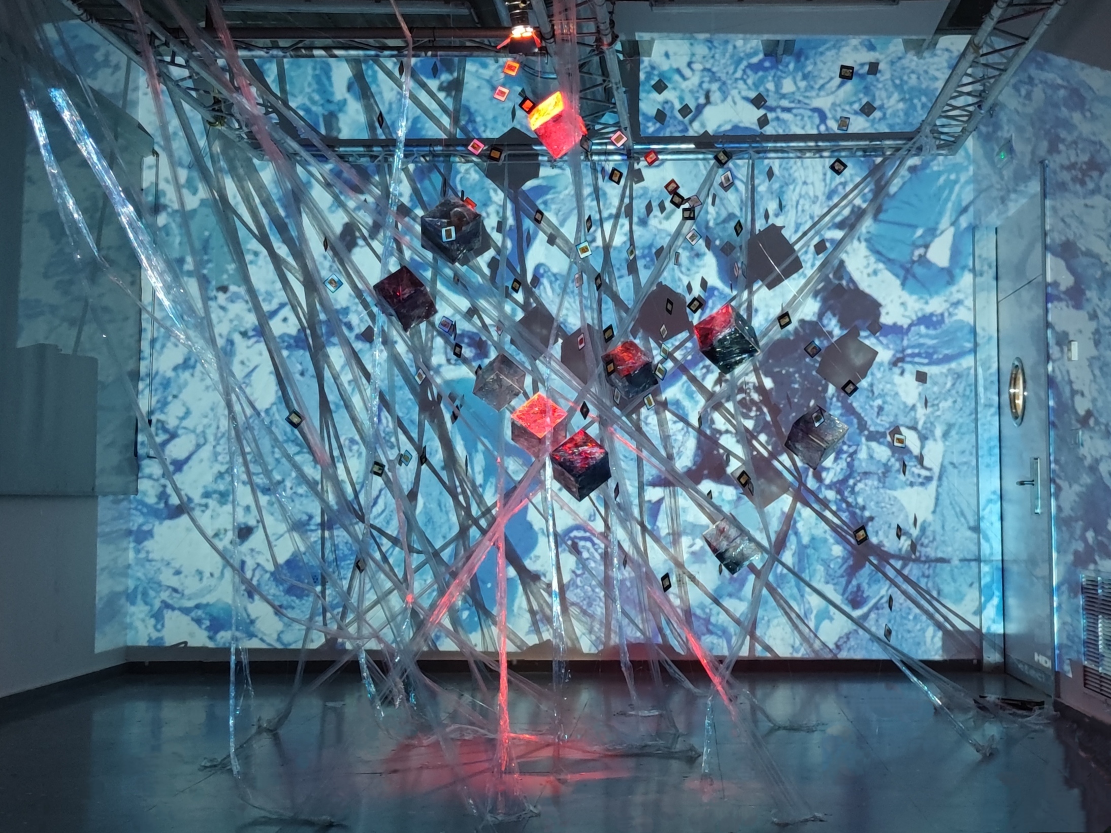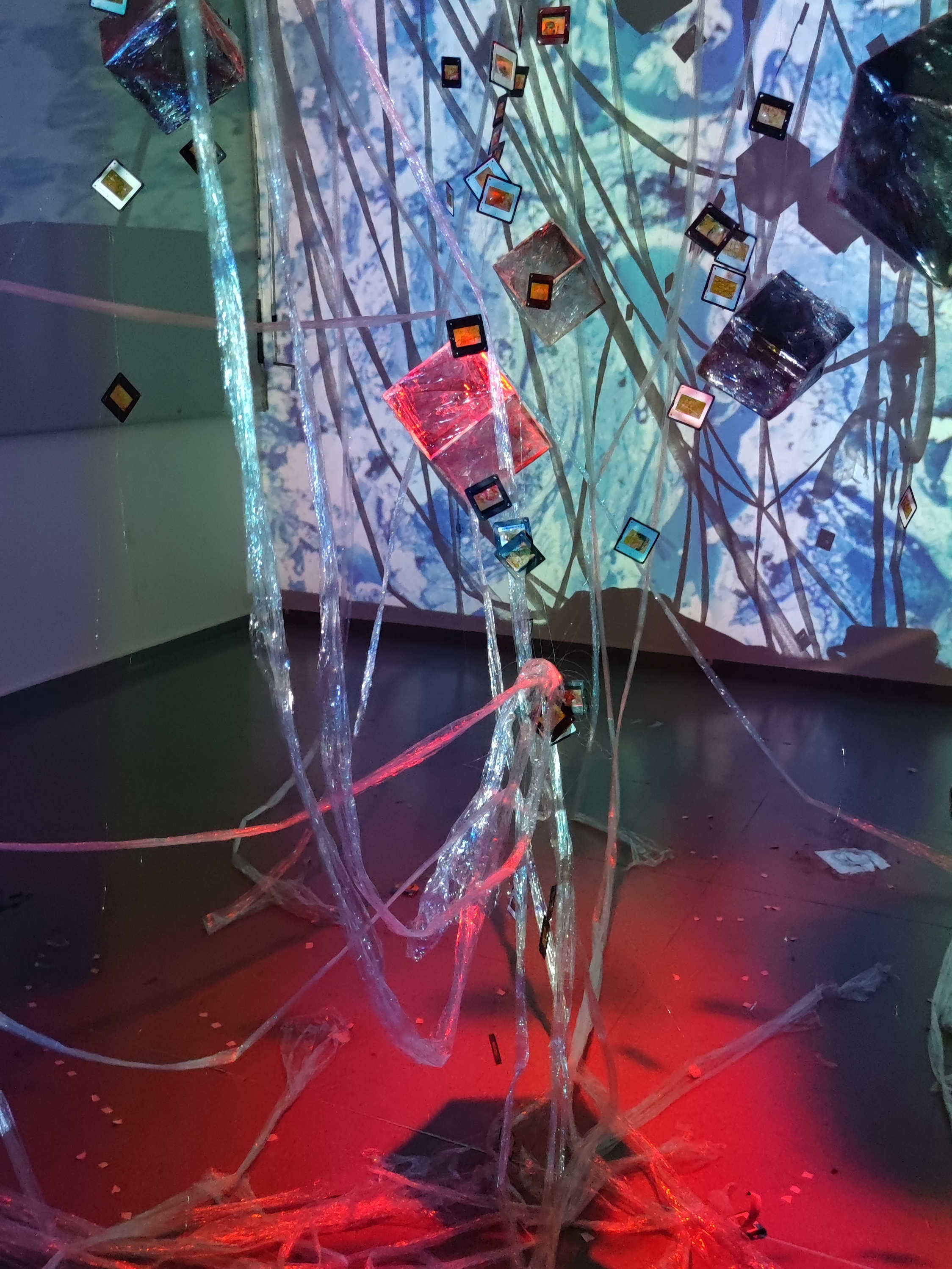Se trata de una obra de instalación interactiva en un espacio oscuro, que está compuesta por 1 00 diapositivas pintadas de 3 tipos, 10 cubos, los papeles film escalonado entre los dispositivos y los cubos, proyección de efecto de agua, y banda sonora de fuego, agua y la campana.