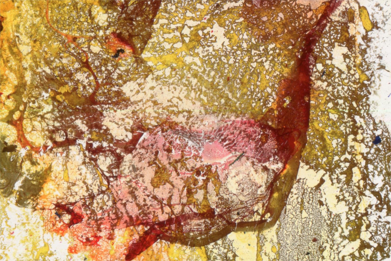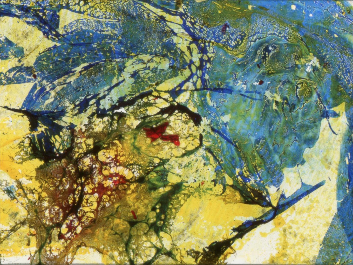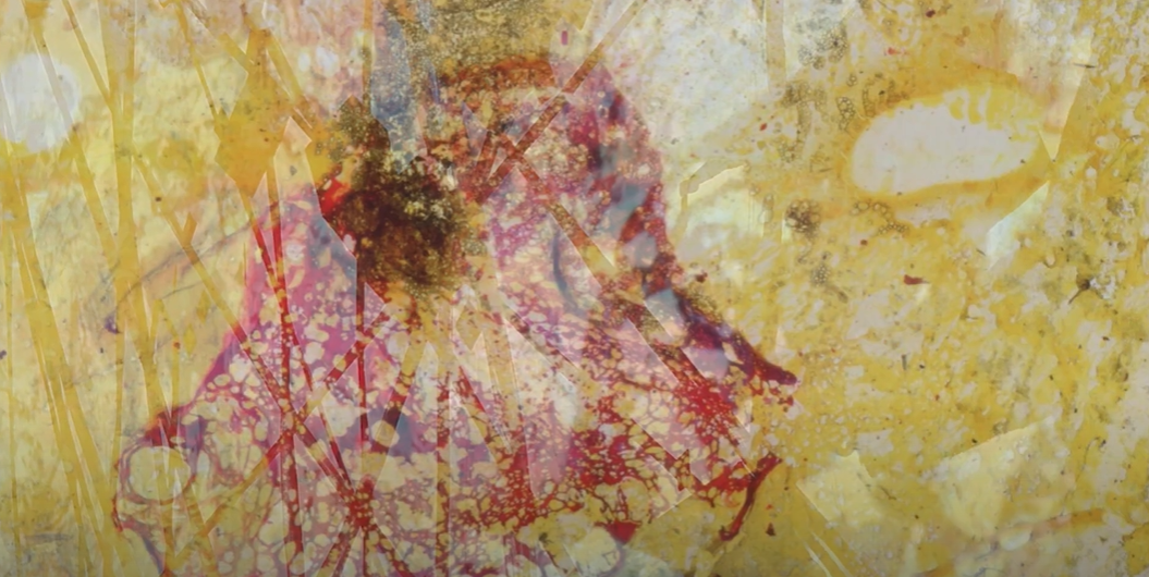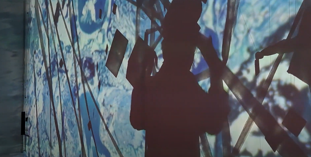 Se trata de una obra de instalación interactiva en un espacio oscuro, que está compuesta por 1 00 diapositivas pintadas de 3 tipos, 10 cubos, los papeles film escalonado entre los dispositivos y los cubos, proyección de efecto de agua, y banda sonora de fuego, agua y la campana.